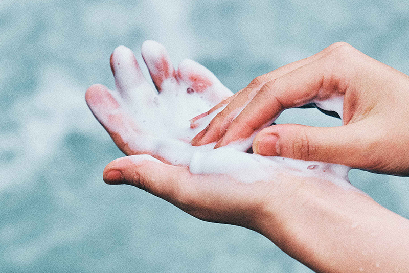 お顔をぬらした後、適量の泡を手に取り、こすらず、やさしく肌を包み込むように洗います。